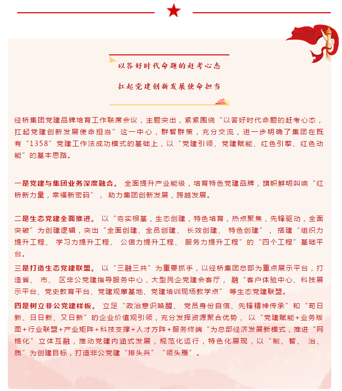 經橋集團堅持黨建引領,用統(tǒng)戰(zhàn)聚力,企業(yè)新動能發(fā)展之基,用人文共創(chuàng),黨建統(tǒng)戰(zhàn)現(xiàn)時代引領生機。